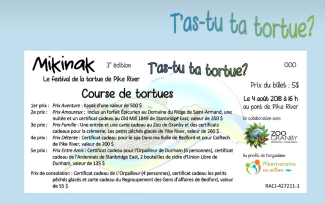 L’achat d’un billet vous octroie une tortue portant le même numéro de votre billet. Le jour de l’évènement, le 4 août 2018, à 16 h, débutera la course des tortues au pont de Pike River.
